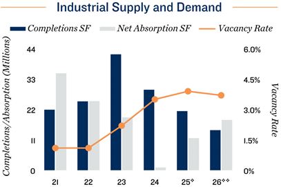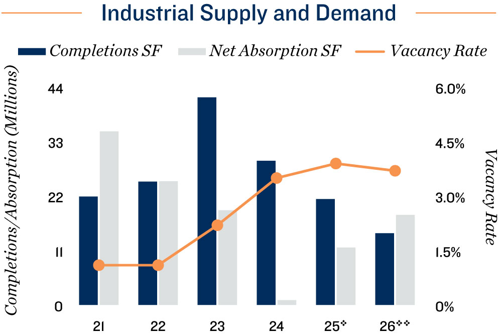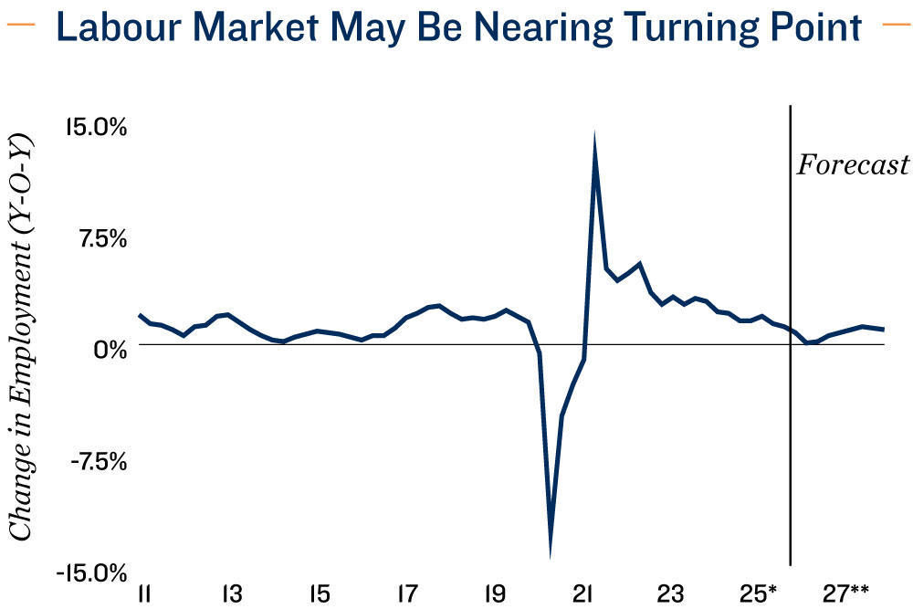 Industrial momentum signals potential market turning point. October’s hiring surge across trade-exposed sectors may mark an early sign that Canada’s industrial real estate market is stabilizing. As these segments regain footing, demand for logistics and production space could begin to firm through early 2026, setting the stage for a gradual improvement in occupancy and absorption later in the year. This outlook is further supported by a more accommodative monetary policy backdrop, which should bolster consumption and business investment, alongside greater clarity on trade policy and the winding-down of Canada’s historic industrial construction cycle. Together, these forces point to a sector transitioning from correction toward renewed balance, with vacancy likely to peak around 4.0 per cent before inching slightly lower next year.