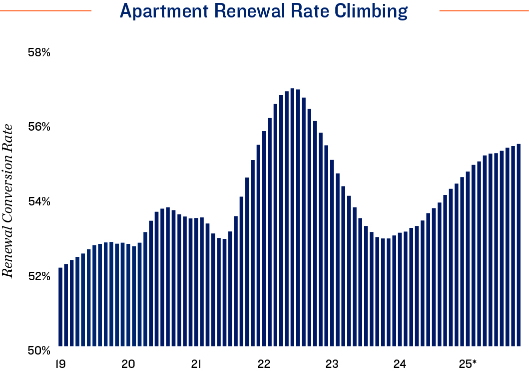 Higher alternative costs keep households renting. One recent trend supporting multifamily housing demand has been the decline in renters migrating into homeownership.
