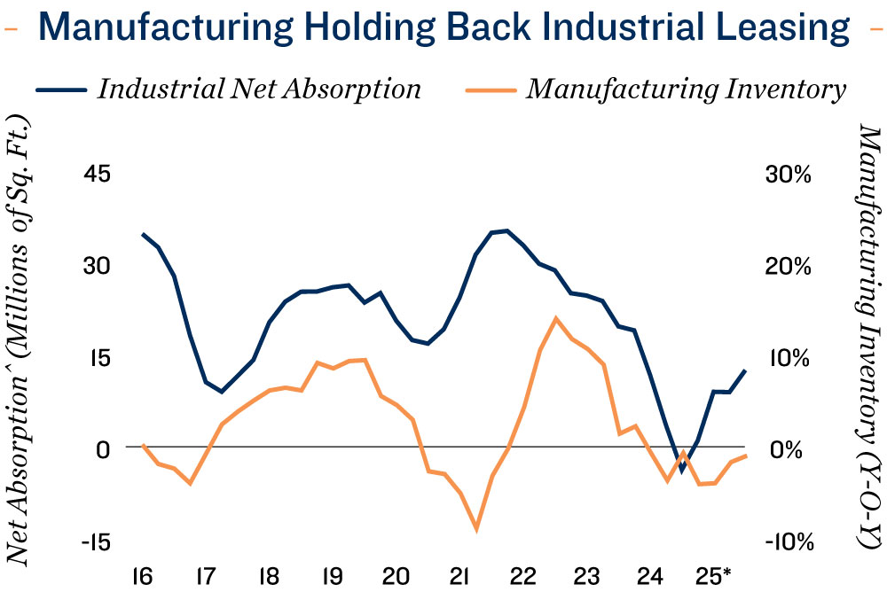 Industrial bifurcation expected. Further job losses in the manufacturing sector highlight rising caution among export-oriented firms navigating tariff exposure. While national industrial fundamentals remain solid — with net absorption improving this year and vacancy hovering around 4.0 per cent by year-end — a softer manufacturing backdrop could temper space expansion plans for heavy-industrial users. Growth is more likely to skew toward logistics, energy-related and transportation users, while Ontario and Quebec manufacturing markets may face slower deal velocity and more conservative footprint decisions. In contrast, energy and logistics-driven markets with more diverse trading partners are better positioned to carry momentum into 2026, even if uncertainty weighs on parts of the export economy.