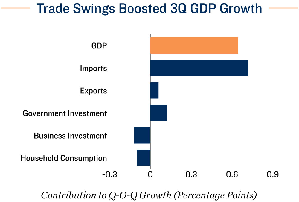 Growth rebounded on trade swings. Canada’s GDP expanded at a 2.6 per cent annualized pace in the third quarter, far surpassing market expectations for a 0.5 per cent increase. The upside surprise was driven largely by an 8.6 per cent pullback in imports and a 12.2 per cent jump in government investment. However, private sector demand remained subdued. Business investment in nonresidential structures, equipment and machinery fell 4.5 per cent, reflecting businesses’ limited appetite to expand operations amid trade uncertainty. Intellectual property investment also declined 2.4 per cent, indicating that the economy has yet to experience a meaningful boost from AI-related investment. Household spending also slipped 0.4 per cent, as a 2.0 per cent drop in goods consumption outweighed a modest 0.7 per cent increase in services.