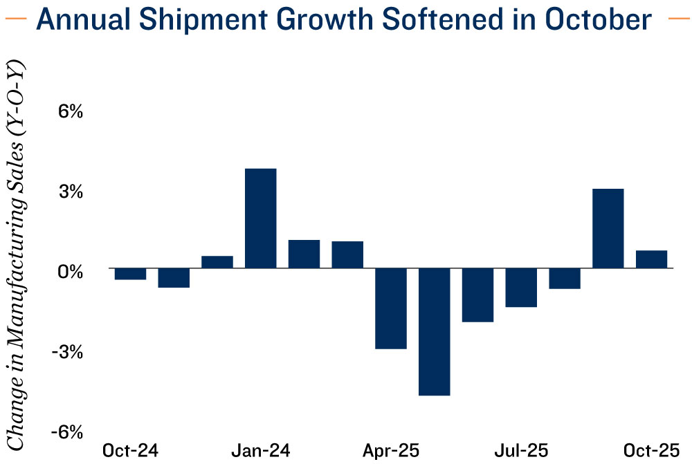New tariffs disrupt manufacturing recovery. After four consecutive months of improvement, Canada’s manufacturing sales increased at a slower annual pace, weighed down by shipments falling 1.0 per cent in October. The sector faced a renewed shock as the United States imposed tariffs on softwood lumber, resulting in a 9.0 per cent monthly drop in wood product shipments. Transportation equipment sales also fell, down 2.3 per cent, driven by weaker production of aerospace products and parts. Looking ahead, shipments in the transportation equipment sector could remain under pressure entering 2026, as new U.S. tariffs of 25 per cent on medium- and heavy-duty trucks and 10 per cent on buses took effect in November. Moreover, ongoing efforts by several automakers to move parts of production capacity south of the border could further strain the sector, affecting overall sales in the short term.