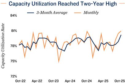 Firms operating at relatively high capacity. Even as total manufacturing sales declined, the manufacturing capacity utilization rate rose to 80.7 per cent — its highest level since March 2022 — driven by gains in the food, petroleum and coal subsectors. This divergence suggests that manufacturers were operating closer to their maximum output, potentially rebuilding inventories or preparing for future demand despite softer current sales. If this momentum continues, manufacturers may find it more compelling to seek additional or larger industrial space to meet production needs. This could provide a supportive backdrop for leasing activity in the industrial sector entering the new year.