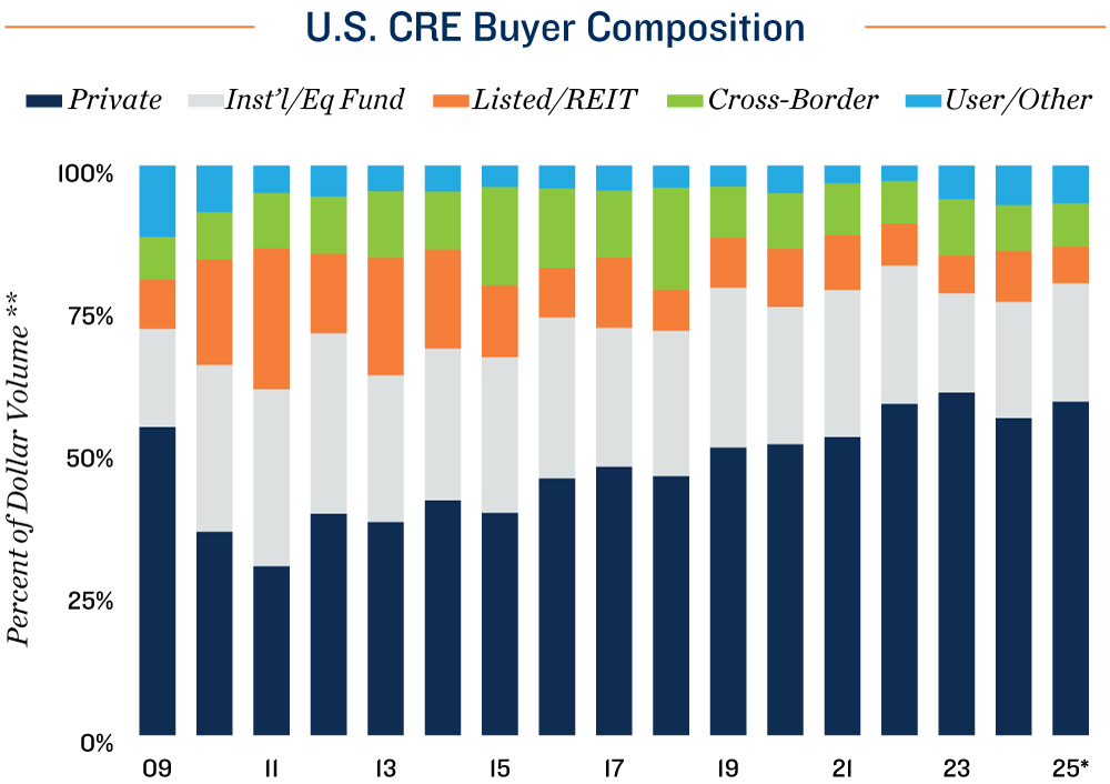 Private investors continue to outpace institutional buyers. The buyer composition of commercial real estate assets has consistently been dominated by privately sourced capital.