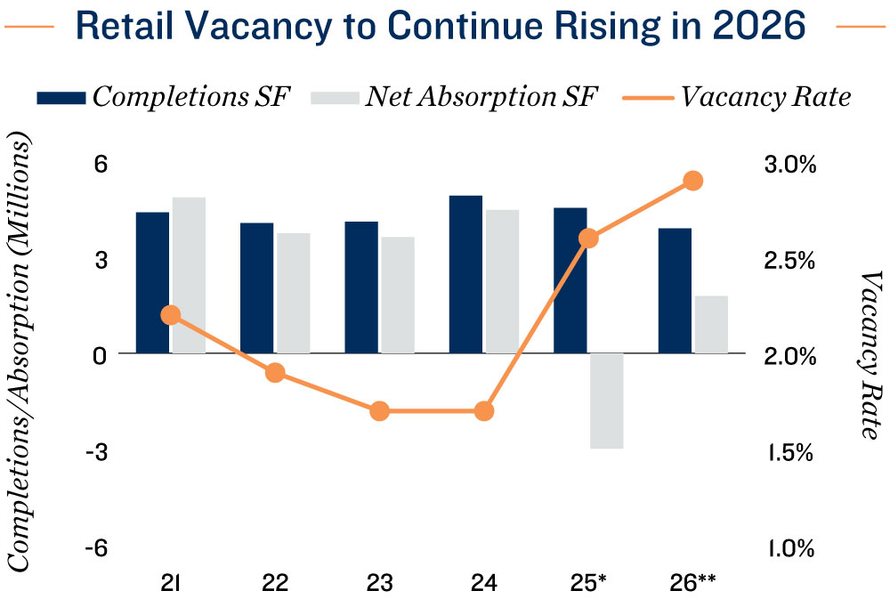 Soft labour market conditions weigh on retail sector recovery. One area of concern in the latest survey is the rising share of businesses planning to reduce their employee headcount over the next 12 months. This caution is echoed in the latest consumer expectations survey, which shows an increase in the share of consumers concerned about potential job losses and missing a debt payment. Together, these dynamics may exert downward pressure on consumer spending in the near term. Combined with persistent uncertainty surrounding U.S. trade policy and a slowing pace of population growth, retailers are likely to remain hesitant to expand their physical storefronts, resulting in a measured recovery in retail space demand. As a result, the retail vacancy rate is forecast to rise in 2026 as net absorption lags behind completions for another year.