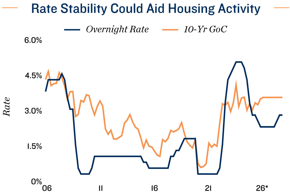 A brighter future could materialize. Canada’s housing market is expected to improve modestly in 2026, supported by a more predictable lending environment that should gradually draw buyers back into the market. With borrowing costs now viewed as stable and major financial institutions forecasting limited rate volatility, improved financing visibility is expected to lift confidence and unlock some pent-up demand. While mortgage rates are likely to remain above recent norms, reduced uncertainty should support a gradual rebound in sales, particularly through the spring market. Price growth is expected to remain measured, constrained by affordability pressures. Still, firmer demand and limited supply in many regions could help stabilize values and support modest gains over the course of the year.