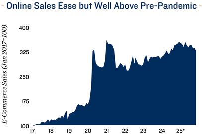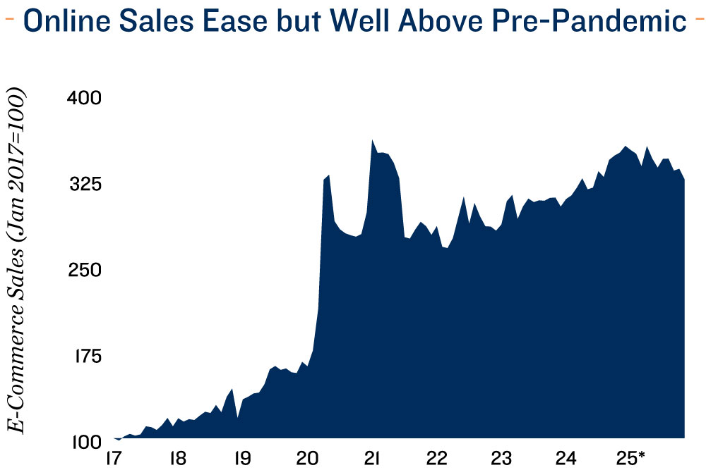 Online softness converges with a stabilizing industrial sector. E-commerce activity continued to soften in November, with online sales down 2.8 per cent monthly and accounting for just 5.7 per cent of total retail trade — the lowest since late 2023. The cooling online demand parallels evolving conditions in Canada’s industrial sector, which opened 2025 with nearly five million square feet of positive net absorption before tariffs halted momentum, pushing absorption negative in the second quarter and keeping it subdued in the third. As interest rate visibility improved and trade headwinds eased, leasing strengthened notably in the fourth quarter. Vacancy followed the same trajectory — tightening early in the year before drifting up and stabilizing around 3.8 per cent by December. Looking ahead, interest rate visibility, a smaller build pipeline, firmer trade clarity, and infrastructure investment should support a gradual improvement, with national vacancy poised to trend down to around 3.5 per cent.