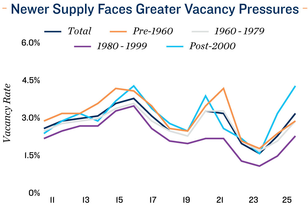 Retail fundamentals hold firm despite market shifts. Canada’s retail property sector remained firmly resilient in 2025, extending the strong performance seen in essential-based formats. Even with vacancy rising 80 basis points following the closure of Hudson’s Bay and softer consumer confidence tied to trade uncertainty, vacancy remained exceptionally tight at 2.5 per cent nationally. Limited new supply continues to underpin fundamentals, as the under-construction pipeline stays scarce — further constrained by the broader slowdown in residential and mixed-use development. With constrained inventory, steady tenant demand, and its defensive nature, Canada’s retail property sector enters 2026 in a position of notable stability.