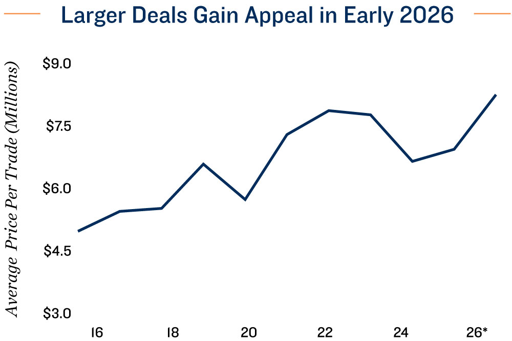 Buyer confidence rising as large-bay properties regain appeal. Preliminary sales data indicate that the average price rose per transaction to approximately $8.2 million in the first quarter, up from $6.9 million last year and $6.6 million in 2024. This increase suggests that buyers began gravitating toward larger, higher-quality assets earlier this year, reflecting a renewed appetite for scale, stabilized income streams, and best-in-class product. The shift points to a gradual improvement in investor confidence, underpinned by solid leasing momentum in select metros and growing conviction that demand for institutional‑quality industrial space is recovering.