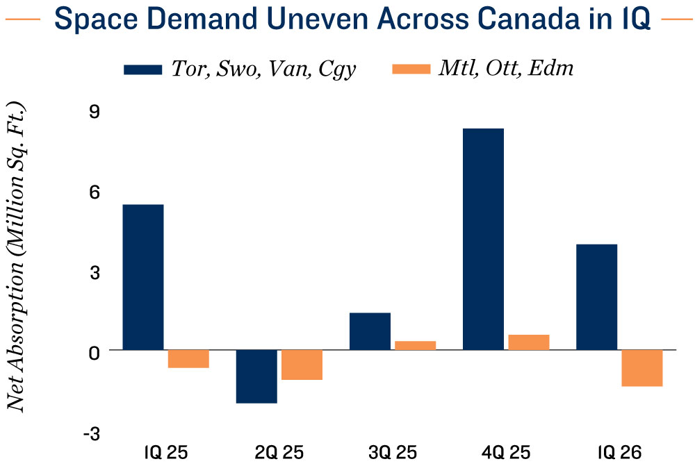 Space demand remains on upward trajectory in select markets. The latest first‑quarter data on net absorption and vacancy rates present an uneven picture of current industrial market conditions. Space demand held up in Toronto, Southwestern Ontario, Vancouver, and Calgary, while leasing activity softened across other major metros after a brief rebound in the second half of last year. In these stronger‑performing markets, tenants have largely looked past trade‑related uncertainty, with leasing decisions increasingly driven by underlying fundamentals such as population growth, supply‑chain reconfiguration, and infrastructure investment. This has translated into improved leasing momentum, particularly for large‑format space, as logistics, distribution, and energy‑related users moved forward with expansion plans.